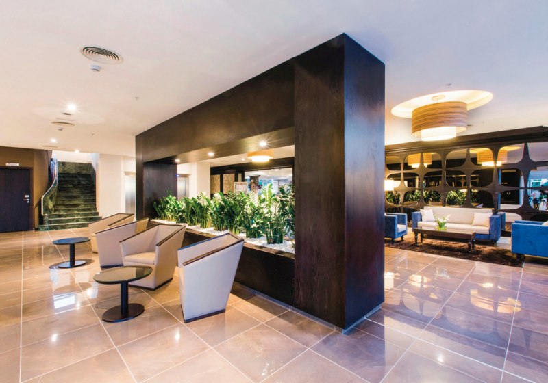Die Infrastruktur ist auf klare Wege und Komfort ausgelegt: zwei Gebäude mit je sechs Etagen, zwei Aufzüge, 24-Stunden-Rezeption und weiträumige Garten- und Terrassenflächen. WLAN ist im gesamten Hotel kostenfrei, Handtücher erhaltet Ihr gegen Kaution. Loungebereich, Foyer und Lounge schaffen ruhige Übergänge zwischen den Bereichen.