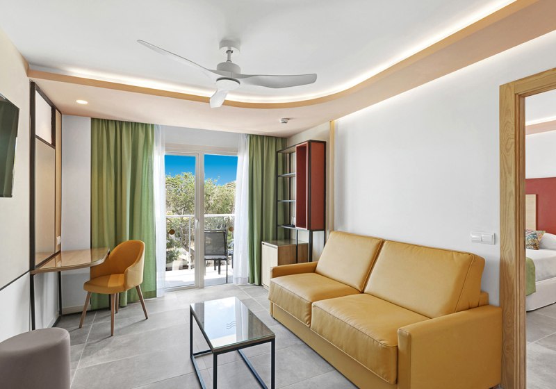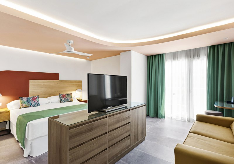 Ihr wählt zwischen Doppelzimmern mit etwa 20 m², großen Doppelzimmern mit rund 28 m² und kombiniertem Wohn-/Schlafraum sowie Juniorsuiten mit etwa 36 m² und separatem Schlafraum. Alle Kategorien bieten Bad/Dusche/WC, Föhn, zentral gesteuerte Klimaanlage, Heizung, Deckenventilator, Telefon, TV, Minibar und einen Balkon.