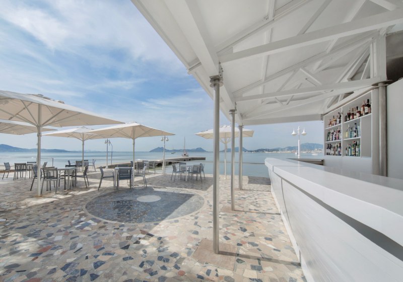- Signature-Drinks: Bar am Abend mit Blick auf Promenade und Meer.