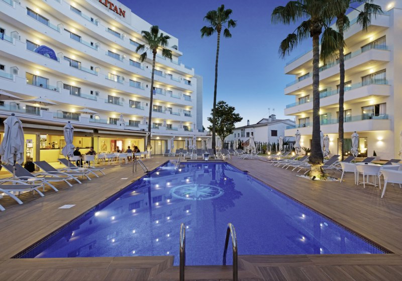 Im Metropolitan Playa Hotel wohnt Ihr in einem modernisierten Haus mit 106 Zimmern auf fünf Etagen, wenige Schritte vom Sandstrand der Playa de Palma. Das Ambiente wirkt klar strukturiert: Lobby mit Rezeption, Lifte und gratis WLAN geben Euch einen unkomplizierten Start in den Tag. Der Außenpool mit Sonnenterrasse, Sonnenliegen und Schirmen lädt zu entspannten Stunden zwischen Strandgängen ein.
