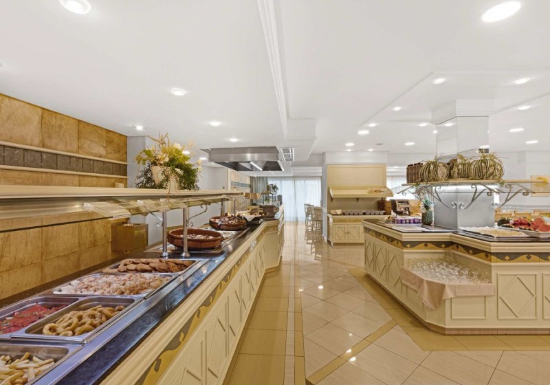 Ihr wählt zwischen Frühstück, Halbpension, Mittag- und Abendessen oder All‑Inclusive. Das Restaurant ergänzt das Angebot mit Live‑Kochen, dazu gibt es Café, Bar, Snackbar und eine Poolbar für kurze Wege zwischen Schwimmen und Snack. Alkoholfreie und alkoholische Getränke sind je nach gebuchter Leistung inkludiert.