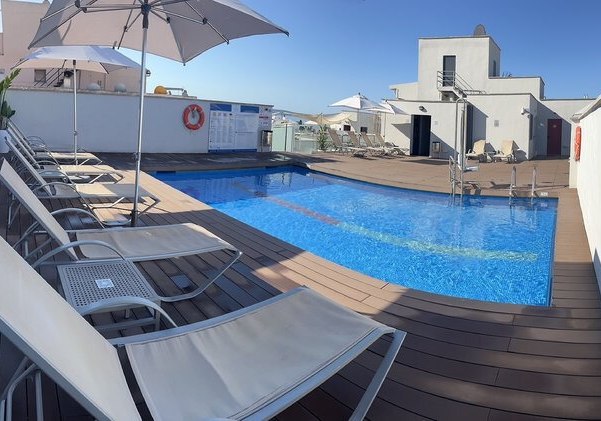 Die öffentlichen Bereiche wirken klar und funktional: Lobby mit 24‑Stunden‑Rezeption, Lift, TV‑Raum und kostenloses WLAN im gesamten Hotel. Auf der Dachterrasse relaxt Ihr auf Liegen unter Schirmen, am Außenpool warten weitere Plätze zum Lesen oder Schwimmen. Badetücher erhaltet Ihr gegen Kaution, Babybetten sind verfügbar. Praktisch: Internetecke, Gepäckaufbewahrung und mehrsprachiger Service.