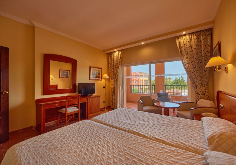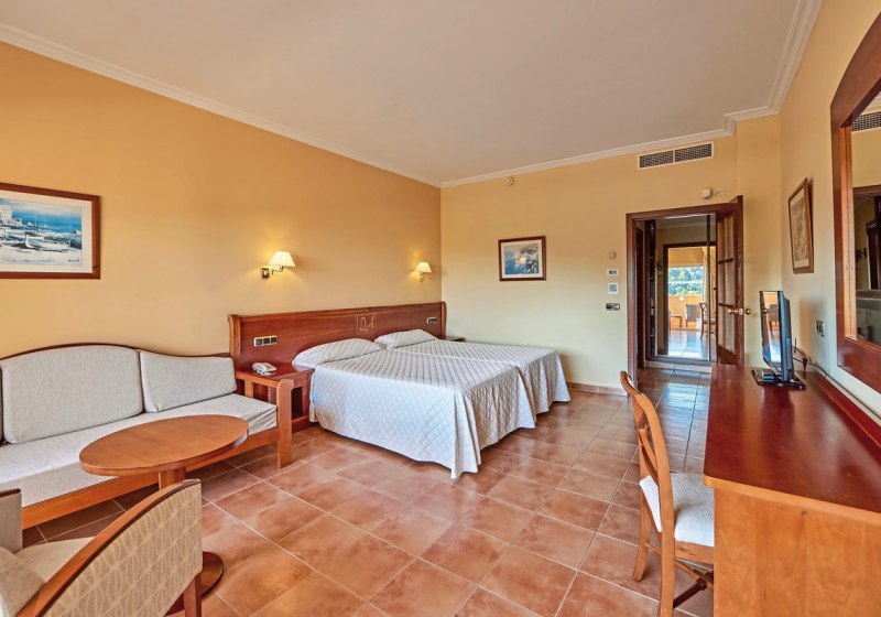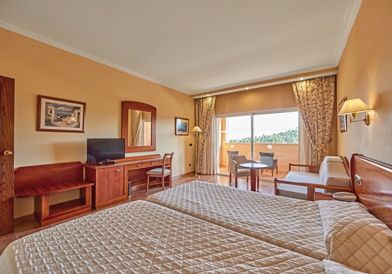 Eure Zimmer sind funktional und angenehm dimensioniert. Doppelzimmer messen etwa 25 Quadratmeter, Familienzimmer bieten zusätzliche Schlafmöglichkeiten. Alle verfügen über Balkon, Dusche/WC, Föhn, Satelliten‑TV, Telefon, Minibar, Klimaanlage/Heizung und Mietsafe. Für den Blick wählt Ihr optional Meer‑ oder Poolseite.
