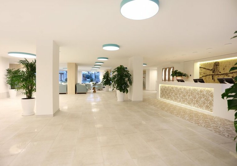 Das Haus öffnet sich mit Lobby, Rezeption und Lounge-Bereichen, dazu Lifte und kostenloses WLAN im gesamten Hotel. Zwei Außenpools, Sonnenterrassen, Liegen, Schirme und Badetücher bilden das ruhige Zentrum. Highlight: Durchdachte Pool- und Terrassenflächen mit klarer Wegeführung.