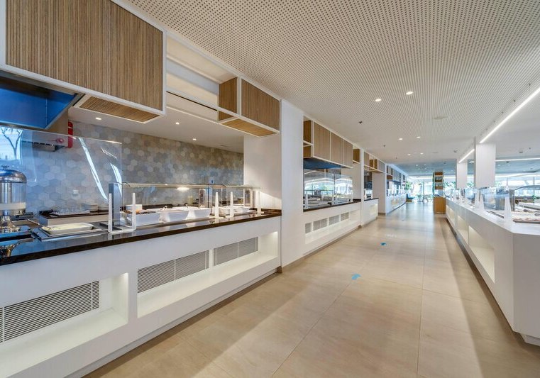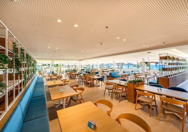 Ihr esst mit Aussicht: Das Restaurant bietet Meerblick und eine Terrasse, die den Blick über Strand und Wellen frei gibt. Morgens und abends erwartet Euch ein Buffet mit Show-Cooking – das Format passt zu unterschiedlichen Geschmäckern und bringt frische, direkt zubereitete Komponenten in Euren Tellerablauf.