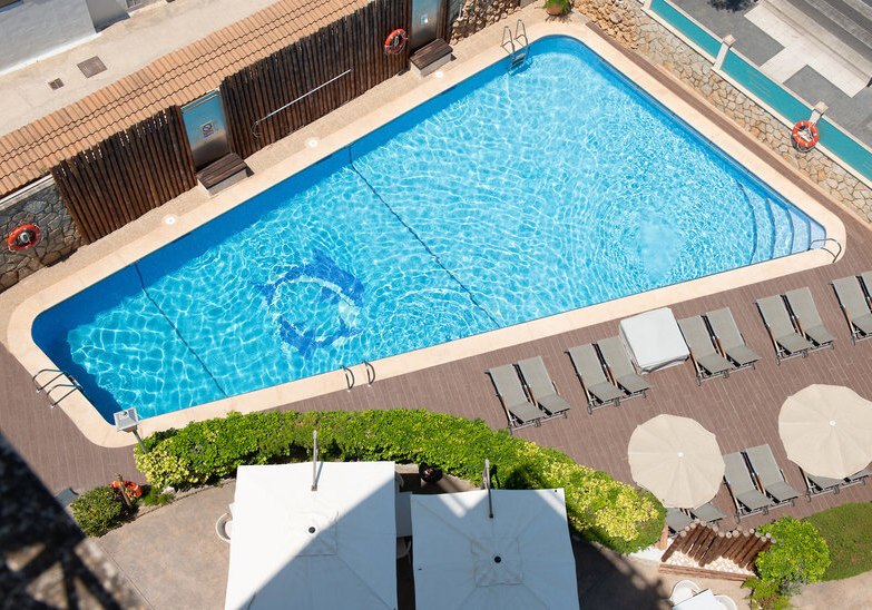 - Poolfokus: Außenpool mit Liegen und Schirmen sorgt für Ruhephasen.