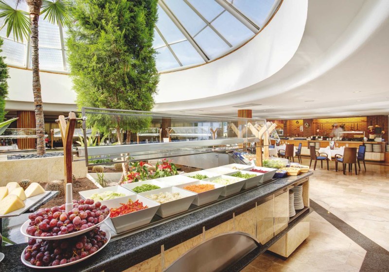 Im Buffetrestaurant speist Ihr mit Blick in den Garten. Das Show-Cooking bringt Frische direkt an die Stationen und strukturiert die Mahlzeiten angenehm. Beim Frühstück und Abendessen greift Ihr auf ein breites Angebot zu, ergänzt um vegetarische und Diätoptionen.