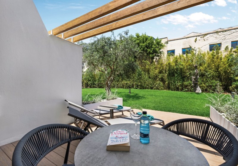 Ihr wählt zwischen Doppelzimmern, Superior, Select und Suiten – alle mit Dusche, WC, Föhn, Klimaanlage, TV, Minibar, Mietsafe, Telefon und Balkon oder Terrasse. Die Doppelzimmer messen etwa 22 Quadratmeter. Superior liegen im Erdgeschoss mit großer Terrasse, was die Wege zum Garten kurz macht.