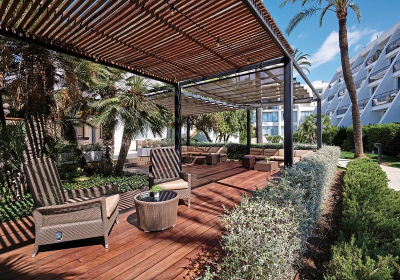 - Sonnenterrasse: Liegen und Schirme warten in der weitläufigen Gartenanlage.