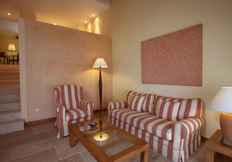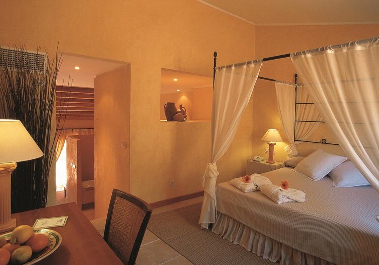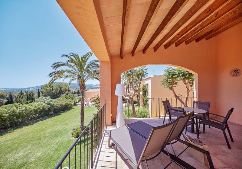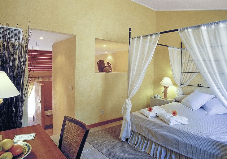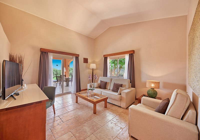 Die Suiten messen je nach Kategorie etwa 42 bis 52 m² und bieten Bad/Dusche/WC, Bademäntel, Föhn, Telefon, Sat‑TV, Minibar, Safe sowie Klimaanlage/Heizung. Eine möblierte Terrasse erweitert den Wohnraum ins Freie – ideal für den ersten Kaffee mit Tee‑/Kaffeezubereitung am Morgen.