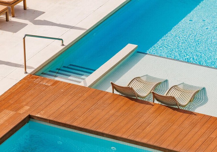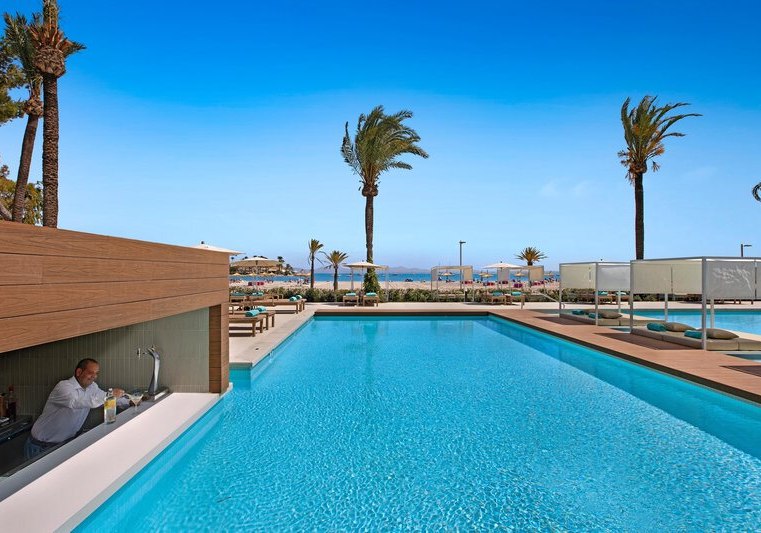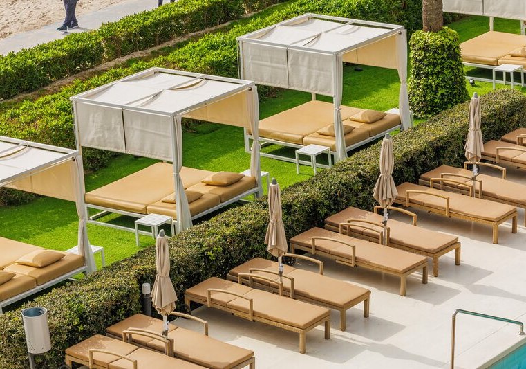 - Strand-Setup: Liegen und Schirme an Pool und Strand sorgen für Komfort.