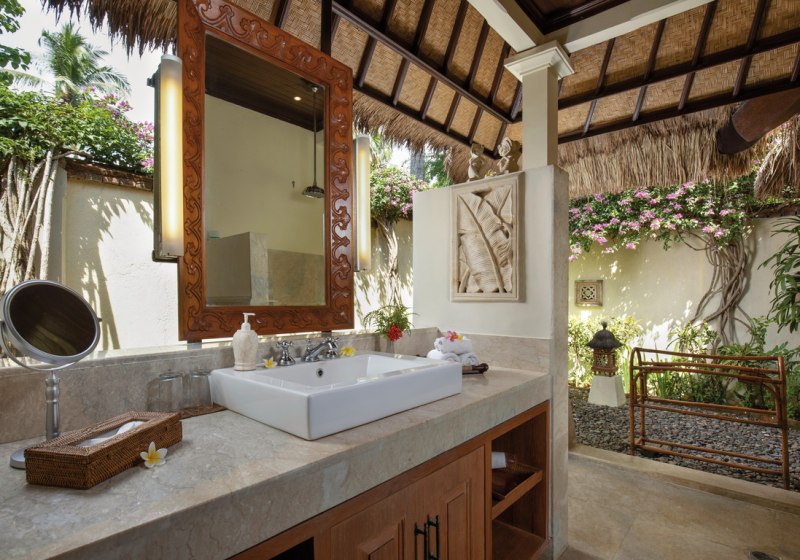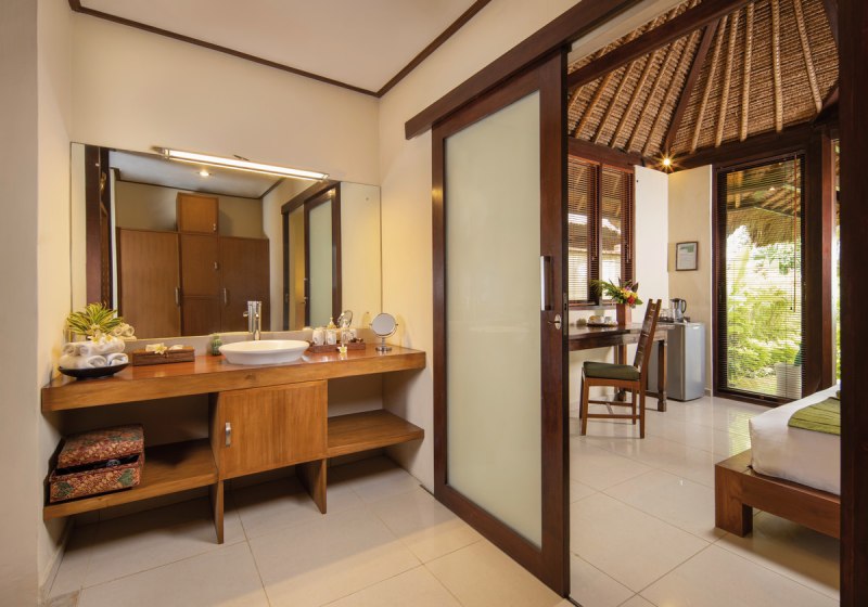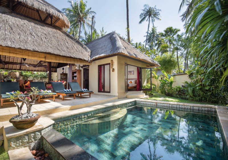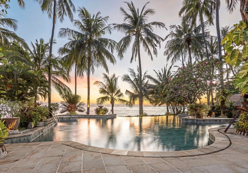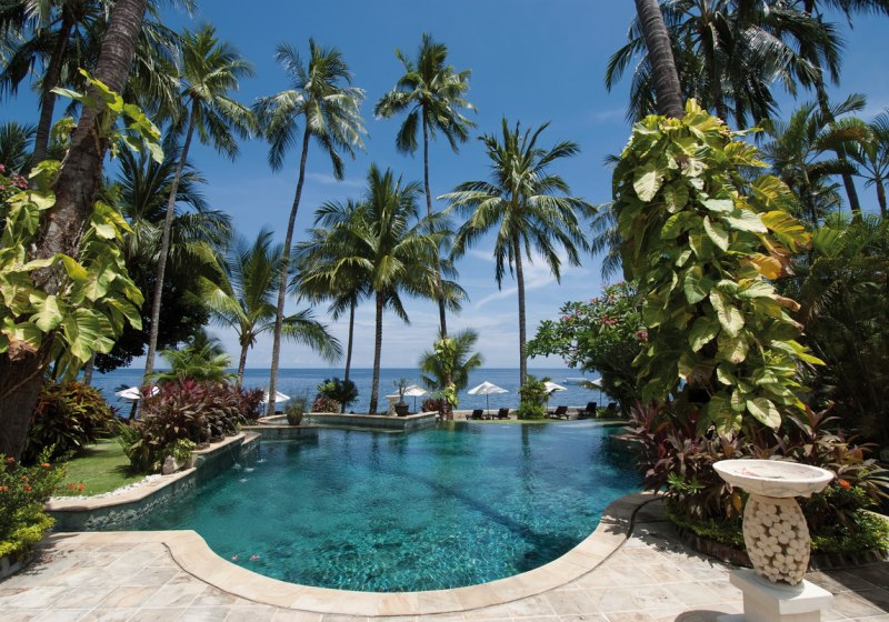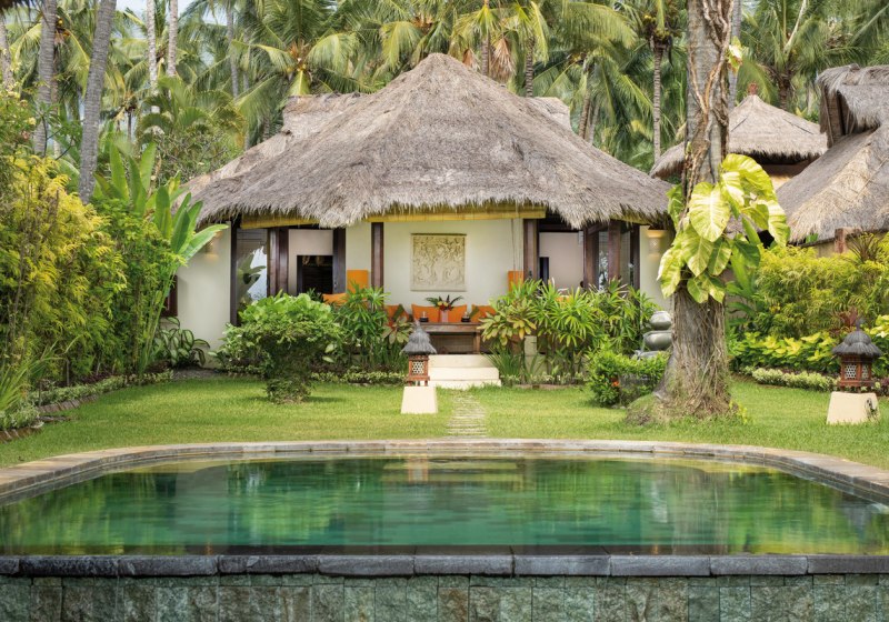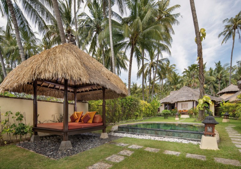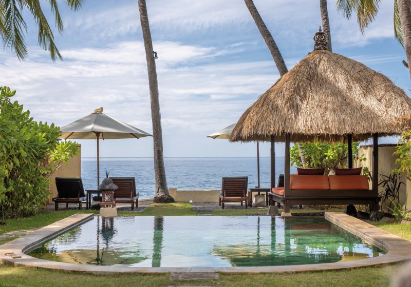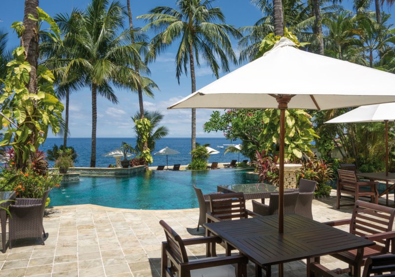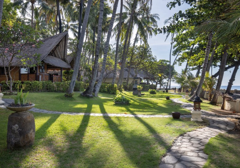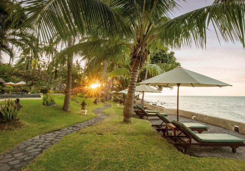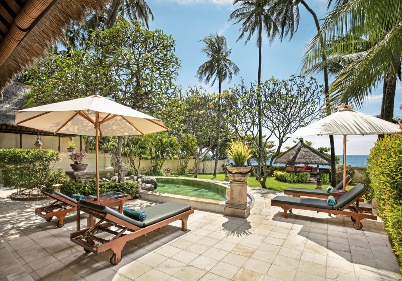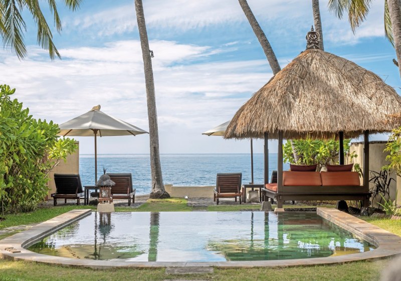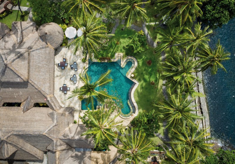 Im Alam Anda Ocean Front Resort & Spa wohnt Ihr in einer entspannten Rückzugswelt an Balis Nordostküste, direkt am Kiesstrand. Die Anlage ist bewusst überschaubar und setzt auf Raum und Grün: Ein weitläufiger Palmengarten umgibt 29 Bungalows und Villen, dazwischen der Außenpool mit Liegen, Sonnenschirmen und Badetüchern. WLAN trägt Eure Reisepläne durch die gesamte Anlage, während Ihr Euch zwischen Pool, Gartenwegen und Terrasse bewegt.