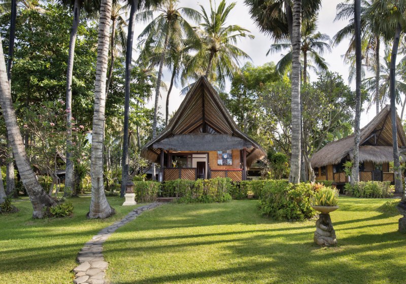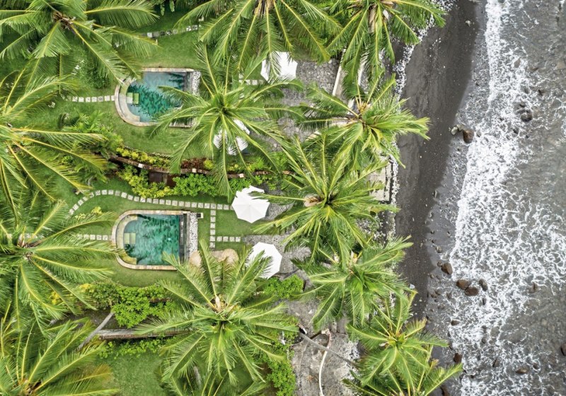 Ihr wohnt an der Nordostküste Balis, direkt am Kiesstrand. Der Garten reicht bis ans Meer, was kurze Wege vom Bungalow zur Brandung bedeutet. Die Transferzeit vom Flughafen beträgt etwa 2,5 Stunden, genug, um Distanz zum Alltag aufzubauen und zugleich planbar für Eure An- und Abreise. Vor Ort bestimmt die Küstenlinie den Tagesrhythmus.