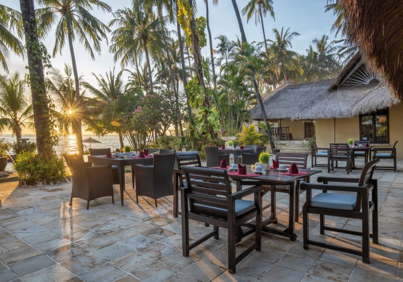 Die Bungalows und Villen bilden Euren privaten Rückzugsort mit Terrasse, Klimaanlage und Minibar. Dazwischen führen Gartenwege zum Kiesstrand, wo die Brandung präsent ist. Der Fokus liegt auf Einfachheit mit Substanz: kurze Wege, klare Angebote, ein dichter Palmenbestand. Hier plant Ihr Euren Tag nach eigenen Vorlieben – vom ersten Kaffee auf der Terrasse bis zum letzten Drink an der Bar.