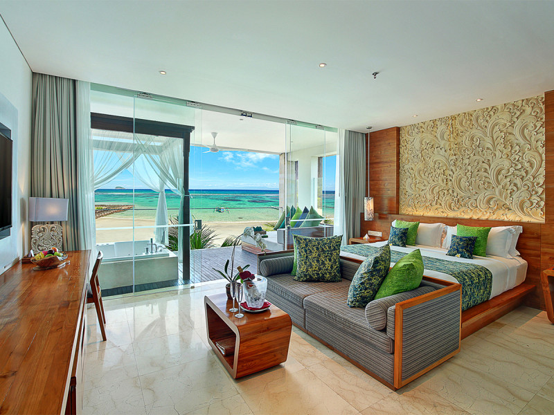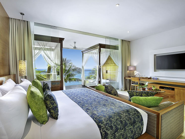 Die 124 Zimmer und Bungalows sowie 19 Pool-Villen verteilen sich harmonisch über das Gelände. WLAN ist in der gesamten Anlage kostenlos, ein Fitnessraum wartet auf kurze Workouts. Drei Restaurants servieren internationale, indonesische und balinesisch-asiatische Küche; eine Bar & Lounge begleitet Eure Abende. Highlight: Direkte Meereslage mit Sandbucht, deren Strandabschnitt bei Ebbe begehbar ist.