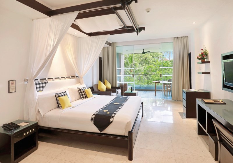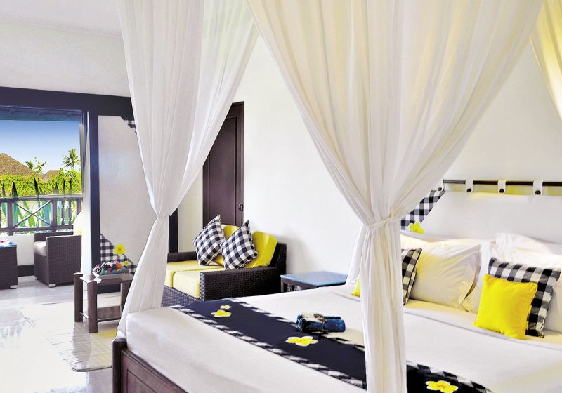 Ihr wohnt in Zimmern mit Bad oder Dusche, WC und Föhn. Zur Ausstattung zählen Telefon, Sat-TV, DVD-Player, Klimaanlage und Moskitonetz. Minibar und Kaffee-/Teezubereiter sind Standard; in den Bungalows ergänzt ein Kühlschrank den Komfort. Safe sowie Balkon oder Terrasse gehören ebenfalls dazu.