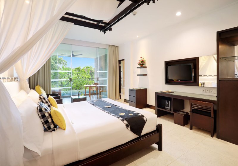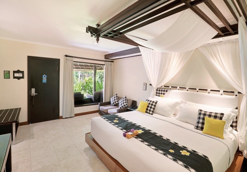 Einige Bäder können offen in den Wohnbereich integriert sein, was das Raumgefühl verändert. Bungalows bieten eine private Terrasse. Viele Zimmer sind mit Queen- oder Kingsize-Betten ausgestattet. So entscheidet Ihr zwischen klassischer Zimmerstruktur im Haupthaus und der gartennahen Variante im Bungalow.
