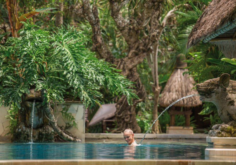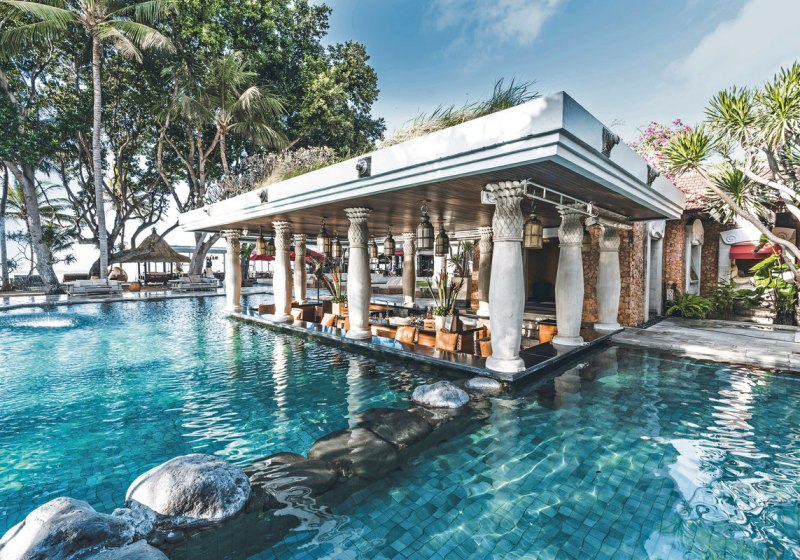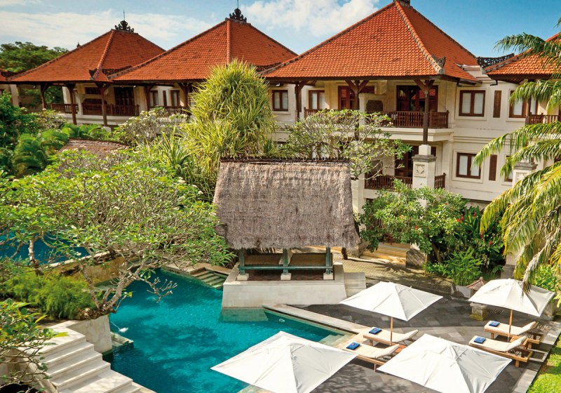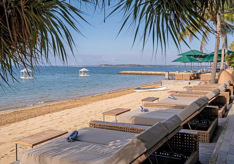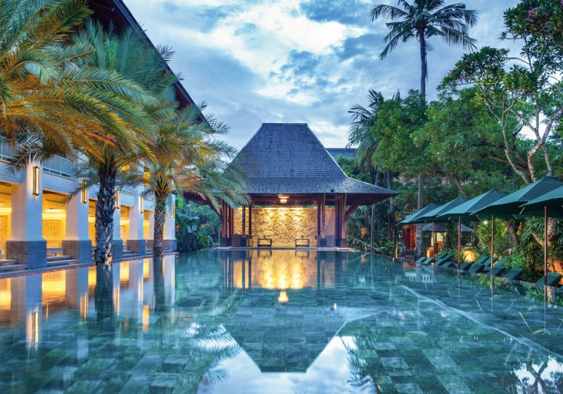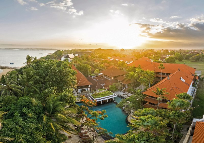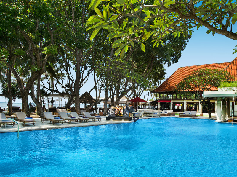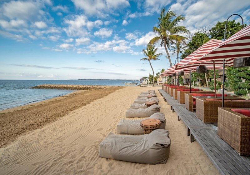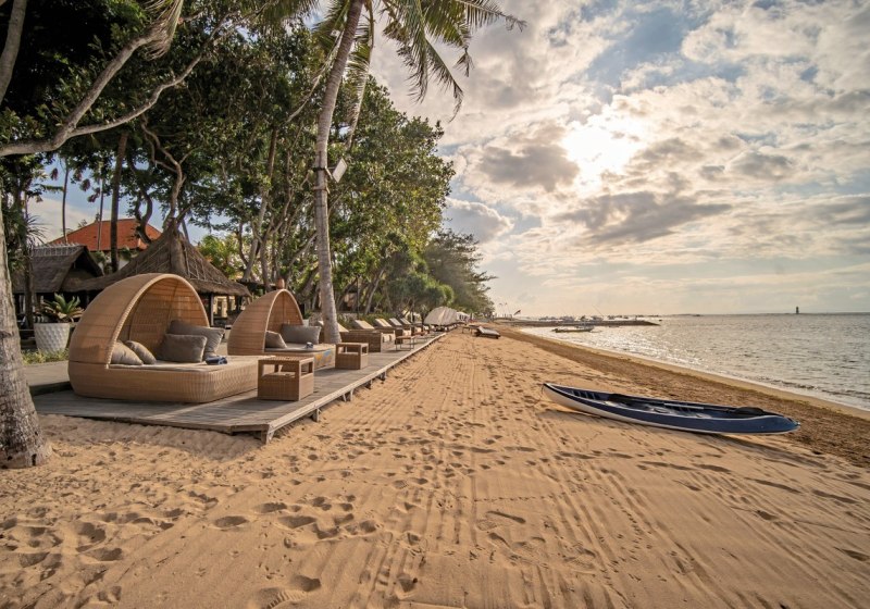 Im Puri Santrian & Spa wohnt Ihr direkt am Sanur-Strand in einem Resort mit tropischem Garten, ruhigen Wegen und weiten Terrassen. Drei Swimmingpools ziehen sich durch die Anlage, während Liegen und Sonnenschirme am Pool und am Strand bereitstehen. Das Ambiente ist entspannt, gepflegt und auf erholsame Strandtage ausgerichtet – ohne überdrehten Trubel.