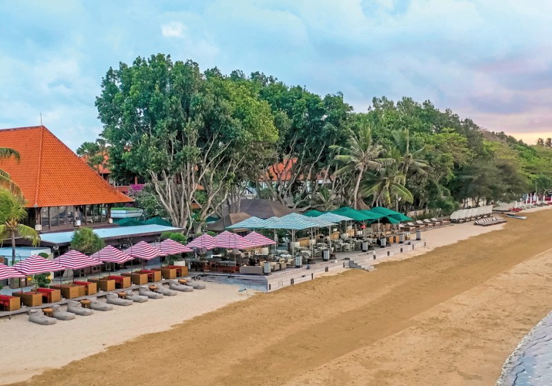 Puri Santrian & Spa kombiniert direkte Strandlage in Sanur mit klar strukturierten Angeboten: mehrere Restaurants inklusive Beach Club, drei Pools, ein Spa mit Massagen und Dampfbad sowie ruhige Abendprogramme. Die Zimmer sind funktional ausgestattet und bieten Balkon oder Terrasse.