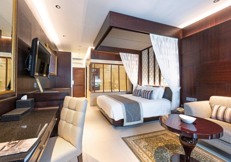 Premier-Deluxe-Zimmer bieten einen kombinierten Wohn-/Schlafraum und Zugang zu einem Gemeinschaftspool. Für Ruhe suchende Paare eignen sich die adults-only Clubzimmer „Santrian“. Praktische Details wie Schreibtisch, Sitzgelegenheiten und Handtuchauswahl runden den Komfort ab; ausgewählte Zimmer eröffnen Blick ins Grüne.