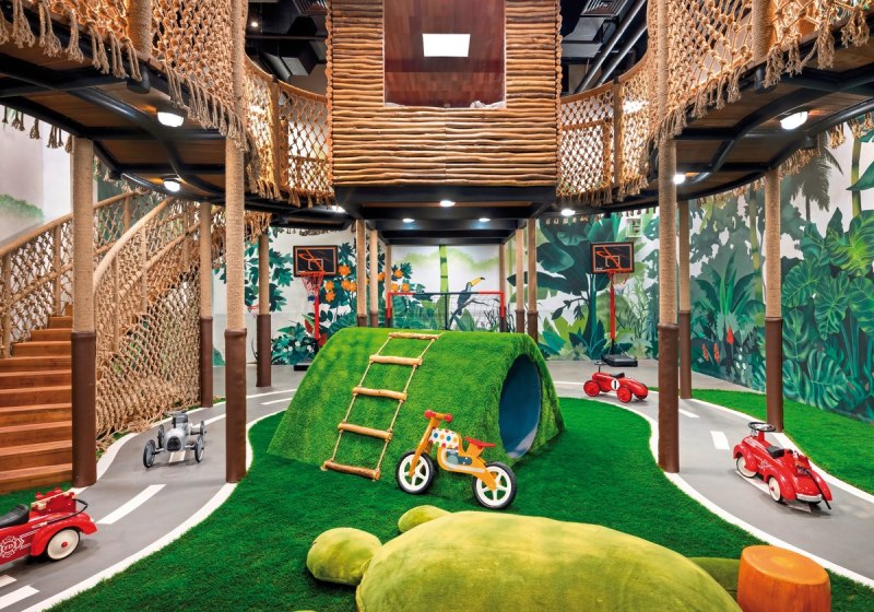 Die öffentlichen Bereiche sind weitläufig angelegt: Gartenflächen, Terrassen und ein grosser Außenpool mit Liegestühlen und Sonnenschirmen strukturieren die Anlage. Zusätzlich stehen Kinderpool, Spielplatz und Spielzimmer bereit. Rezeption, Concierge- und Einparkservice sowie Tour-Desk und Transferservices halten die Abläufe klar und planbar.