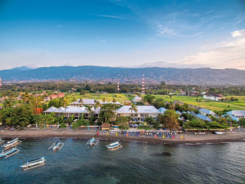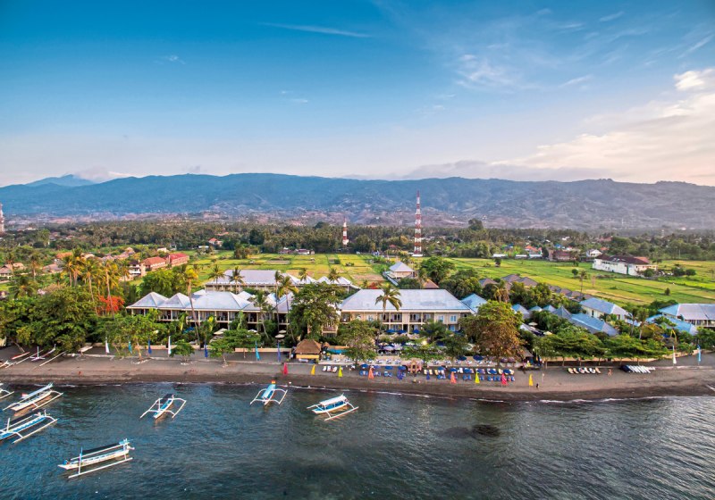 Lovina an Balis Nordküste steht für ruhige Ufer, schwarzen Sand und klare Morgenstimmungen. The Lovina Bali liegt direkt am Strand, nahe den heißen Quellen von Banjar und dem Gitgit-Wasserfall. Der Flughafen befindet sich etwa 100 Kilometer entfernt; vor Ort bringt Euch der Shuttleservice bequem in die Lovina Area. Highlight: Kurze Wege vom Zimmer an den Strand.