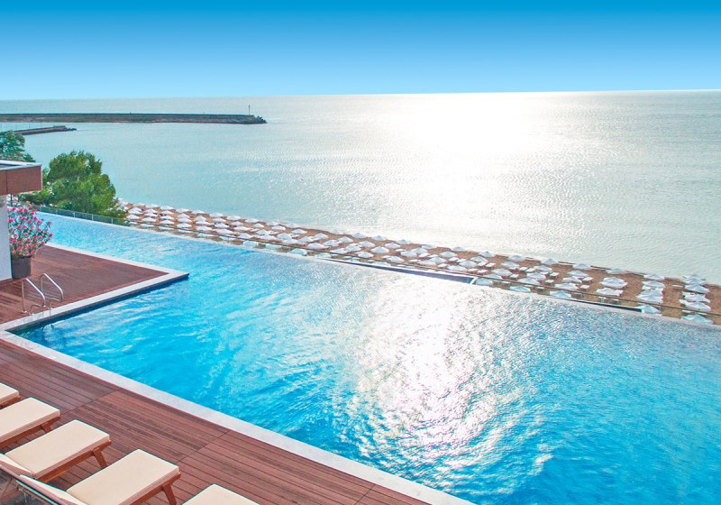 Draußen dominiert Wasser: Infinity-Pool mit Poolbar, separates Kinderbecken mit Rutschen sowie Liegen und Sonnenschirme an Pool und Strand. Für Familien gibt es Spielplatz, Babybetten und eine eigene Teenie-Zone. Parkplätze stehen nach Verfügbarkeit bereit. Highlight: Infinity-Pool verbindet Badevergnügen mit klarer Aussicht.
