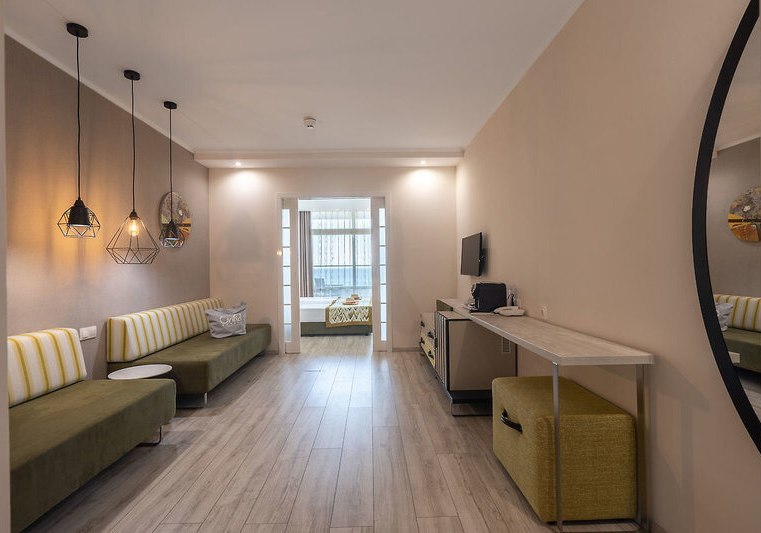 Im GRIFID Encanto Beach wohnt Ihr direkt an der Promenade des Goldstrands, mit dem sanft abfallenden Strand gleich vor Euch und dem Yachthafen nur wenige Schritte entfernt. Die Architektur wirkt zeitgemäß, die Gemeinschaftsbereiche sind klar strukturiert: Lobby mit Meerblick-Terrasse, Aufzüge, viel Glas und Platz zum Ankommen. Familien, Paare und strandaffine Freundesgruppen fühlen sich hier gleichermaßen gut aufgehoben.