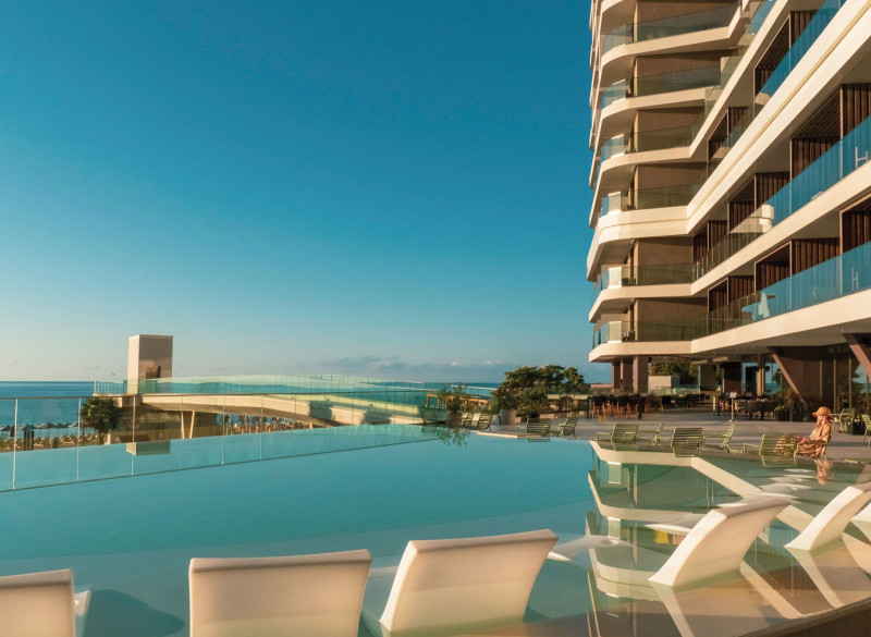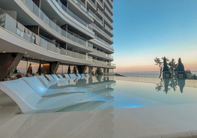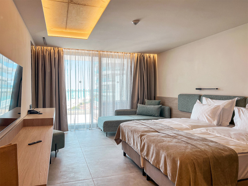 Willkommen im GRIFID Noa, einem großzügig angelegten Neubau mit 12 Etagen, der Euch am nördlichen Teil des Goldstrandes empfängt. Ihr wohnt wenige Meter vom Yachthafen und nur durch die Promenade vom feinsandigen Strand getrennt. Die Atmosphäre ist lebendig, klar strukturiert und komfortorientiert – mit rauchfreien Innenbereichen und Bereichen nur für Erwachsene, die Ruhe schätzen. Die Architektur öffnet sich zur Küste; Terrassen, Bars und Pools fügen sich in einen rhythmischen Tagesablauf aus Sonne, Meerblick und urbaner Strandpromenade.