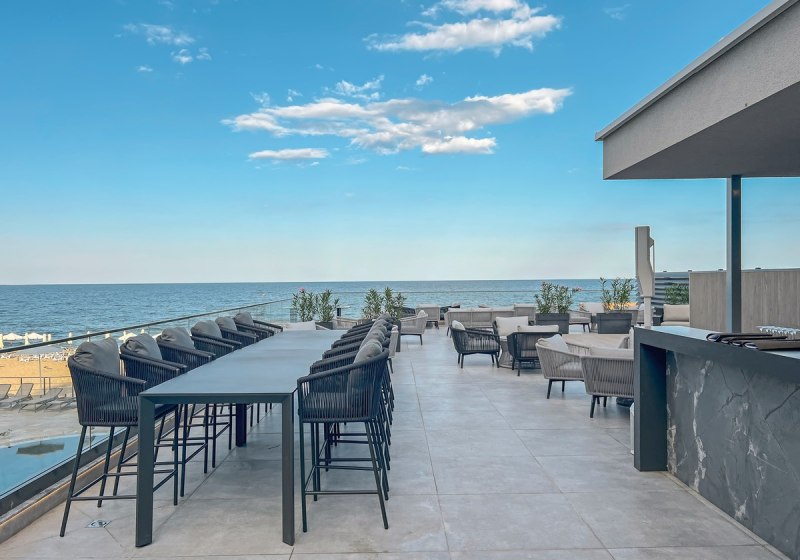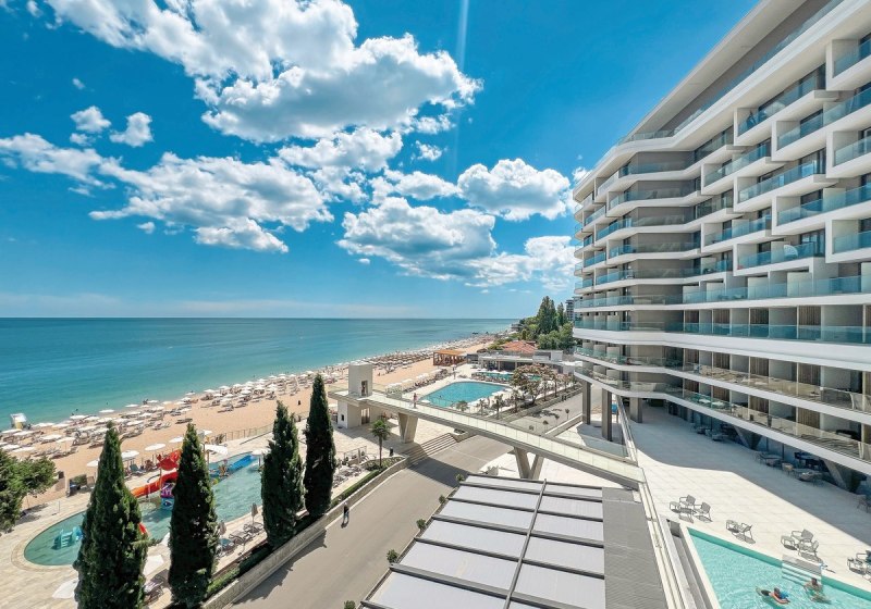 Ihr residiert im nördlichen Abschnitt des Goldstrandes, nur wenige Schritte vom Yachthafen. Der breite Sandstrand liegt direkt gegenüber, lediglich durch die Promenade getrennt – ideal für einen schnellen Wechsel zwischen Meer, Bars und Hotelpools. Bis Varna sind es etwa 15 Kilometer, sodass Ihr Stadtausflüge, Shopping und Kultur angenehm einbinden könnt. Die Umgebung wirkt maritim, mit klaren Blickachsen aufs Wasser und einer belebten Uferzone.