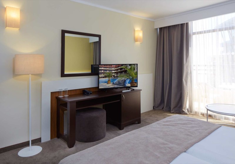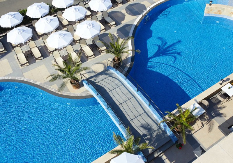 Hotel Nobel empfängt Euch im südlichen Teil von Sonnenstrand am Rand der Dünen – mit klarer Ausrichtung auf entspannte Strandtage und aktive Stunden im und ums Haus. Das Ambiente wirkt unkompliziert und freundlich, die Wege sind kurz, die Bereiche logisch gegliedert: vom großzügigen Außenpool mit Kinderbecken über die Terrassen der zwei Hauptrestaurants bis hin zur Lobbybar. Dank hoteleigenem Strandabschnitt und beheiztem Hallenbad behaltet Ihr Eure Tagespläne flexibel – unabhängig von Wetter und Saison.