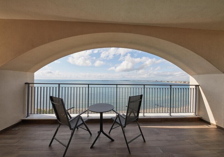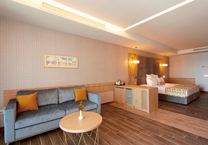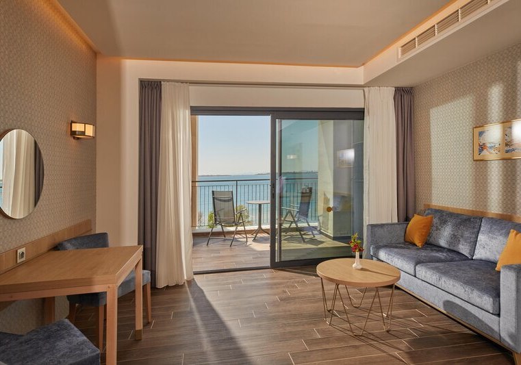 Die Bäder sind mit Dusche, Föhn, Vergrößerungsspiegel sowie Bademänteln und Slippern ausgestattet. Kingsize- oder Twin-Betten stehen je nach Kategorie bereit. Das Zusammenspiel aus zurückhaltendem Design und funktionaler Ausstattung macht den Rückzugsort stimmig. Highlight: Balkone oder Terrassen, teils mit freiem Blick aufs Meer.