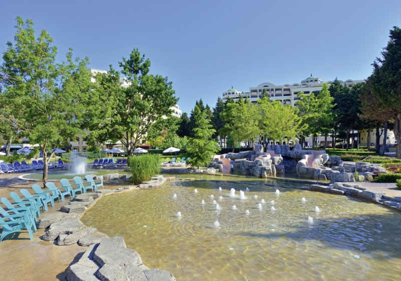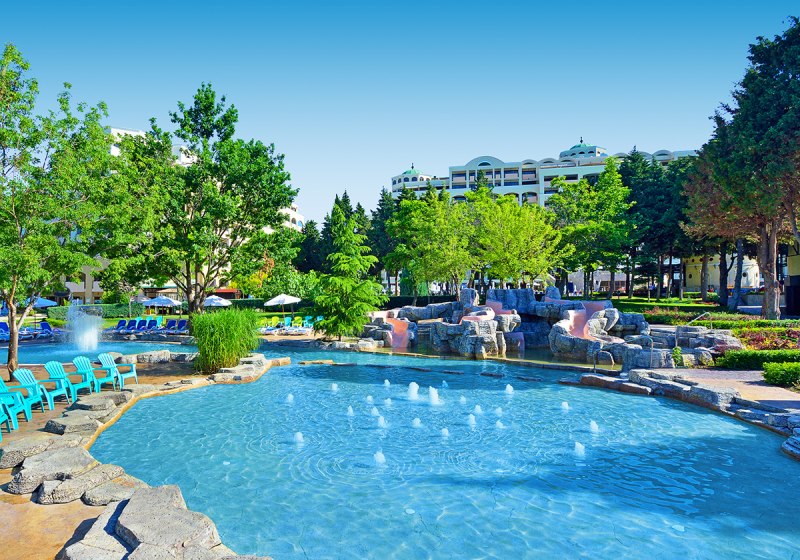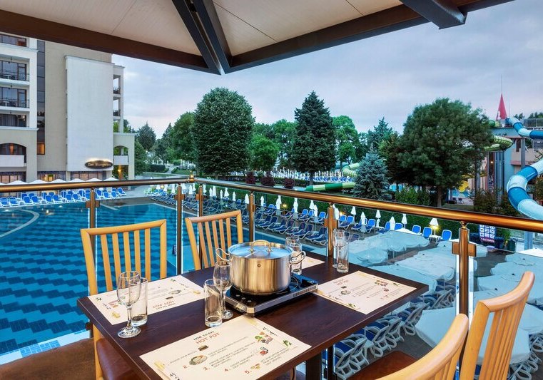 Das Resort ist weitläufig angelegt: Außenpools mit Sonnenterrassen, Liegen und Schirmen bilden das Herz. Der Aquapark mit Wasserrutschen und Rocky River setzt den aktiven Kontrapunkt, Kinderbereiche mit Becken und Wasserspielzone ergänzen. Im Sol Nessebar Palace wartet zusätzlich ein Hallenbad, das wetterunabhängige Bahnen ermöglicht.
