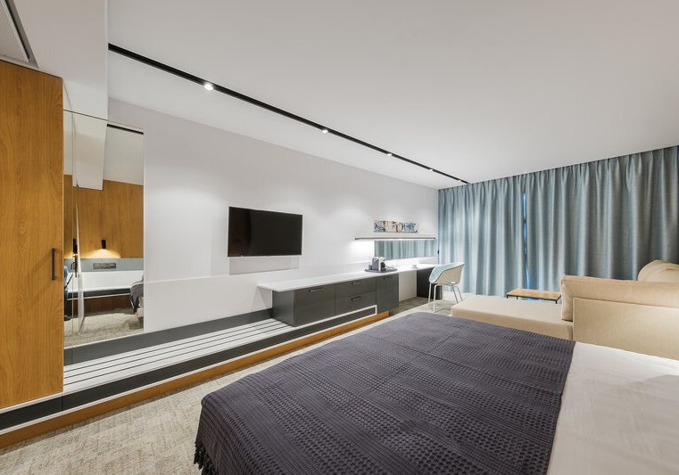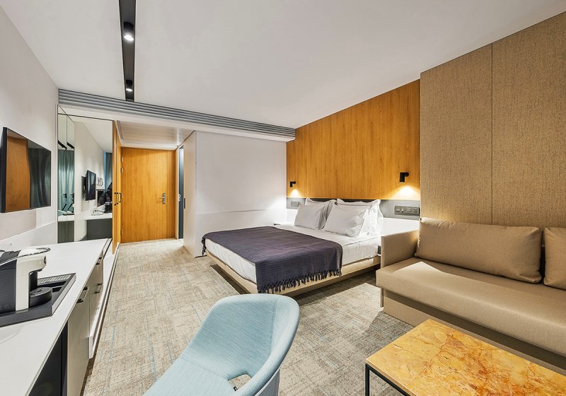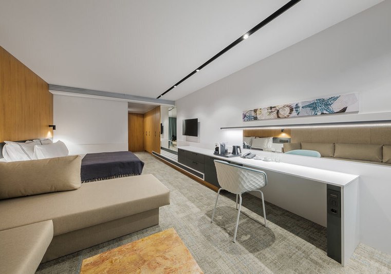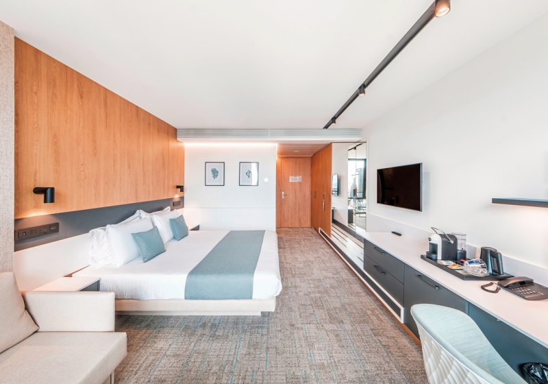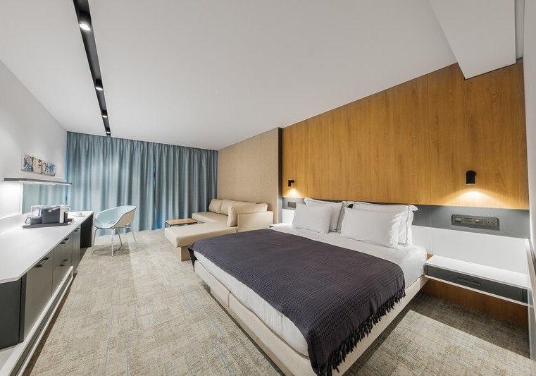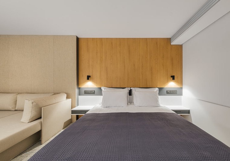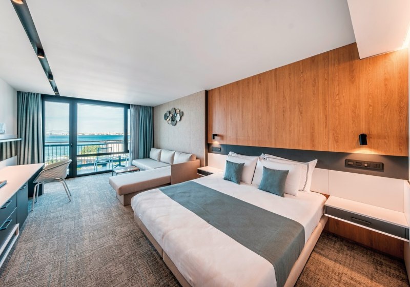 Die Doppelzimmer starten bei ca. 35 m², die Familienzimmer bei ca. 40 m² – jeweils mit Balkon als privatem Rückzugsort. Meerblick-Optionen sind in beiden Kategorien verfügbar. Familienzimmer kombinieren ein Kingsize-Bett (200x180 cm) mit zwei Sofabetten (90x190 cm), sodass Schlafplätze klar definiert sind. Highlight: Familienzimmer mit durchdachter Bettkonfiguration für vier Schlafplätze.