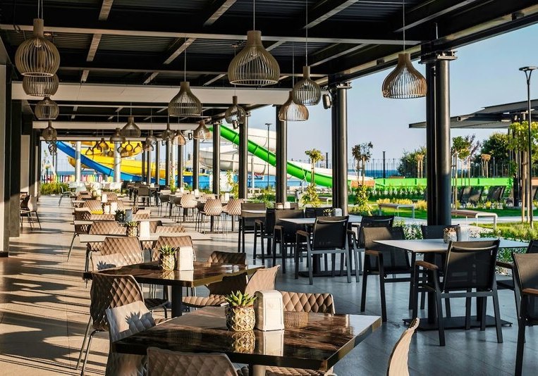 Die Infrastruktur ist auf Familien und klare Wege ausgelegt: Außenpool, zwei Kinderpools und ein Baby-Außenpool verteilen den Badebetrieb. Herzstück ist der Aquapark mit fünf Rutschen, flankiert von Spielplätzen inklusive Piratenschiff. Am privaten Strandabschnitt warten Liegen, Schirme und Badetücher. Das wirkt praktisch, nachvollziehbar und angenehm planbar. Highlight: Aquapark mit fünf Rutschen als Fixpunkt des Tages.