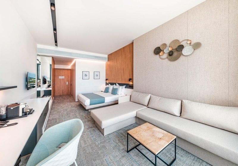 Die 350 Zimmer und Familienzimmer sind auf Komfort ausgelegt, vom Kingsize-Bett bis zur Lavazza-Kaffeemaschine. Jugendliche finden Raum in der Arcade, Kinder auf Piratenschiff-Spielplätzen und in der Mini-Disco. Kulinarisch erwartet Euch ein Hauptrestaurant, zwei À-la-carte-Optionen, Snack- und Patisserie-Bar sowie mehrere Bars. Das Gefühl: ein moderner Strandstützpunkt für aktive Tage, ruhige Stunden und klare Familienlogistik. Highlight: Direkte Strandlage mit privatem Abschnitt und Aquapark als Herzstück.