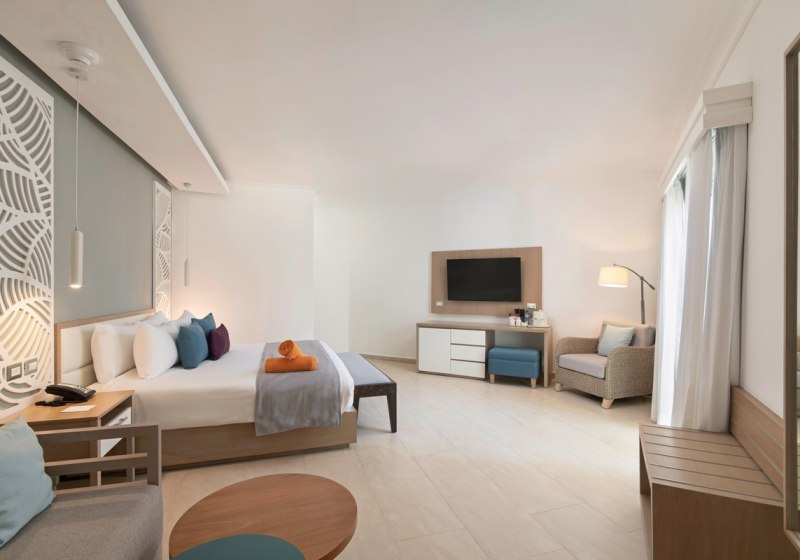 Besonders großzügig fallen die Bungalows auf: mit Wohnzimmer, separatem Schlafzimmer und Kochecke für flexible Routinen in den Ferien. Einige Zimmer sind mit Meerblick gelistet, weitere Annehmlichkeiten wie Schreibtisch und WiFi sind hinterlegt. Das Interieur wirkt zweckmäßig und auf klare Abläufe getrimmt – ideal, wenn Ihr Strand, Pool und Ausflüge in den Mittelpunkt stellt und abends Ruhe und Ordnung im Zimmer schätzt.