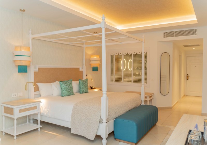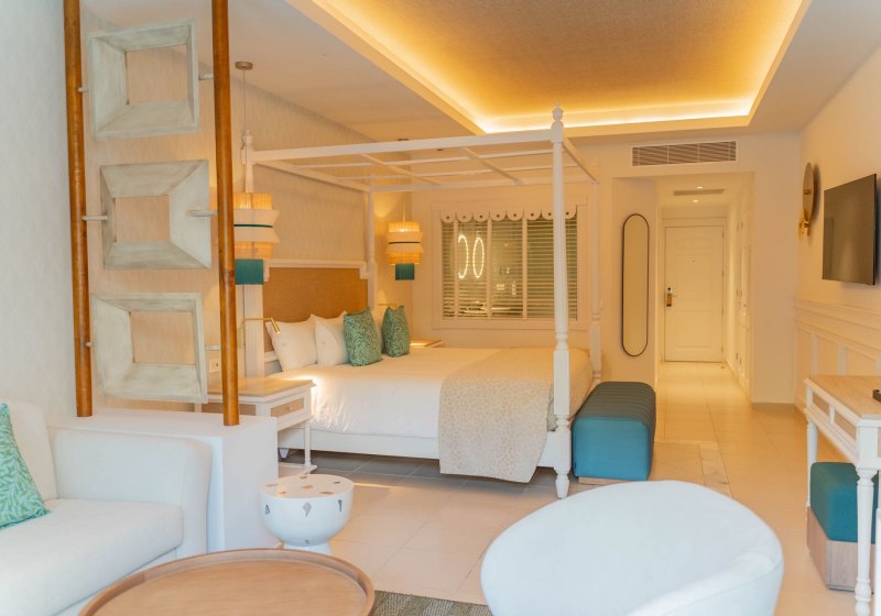 Ihr wohnt in Junior-Suiten mit klaren Komfortdetails: Klimaanlage, Deckenventilator und ein Kissenmenü sorgen für das passende Raumgefühl. Das Bad kombiniert Whirlpoolwanne und Dusche, ergänzt um Föhn und Vergrößerungsspiegel. Balkon oder Terrasse öffnen den Blick in die Anlage oder ins Grüne.