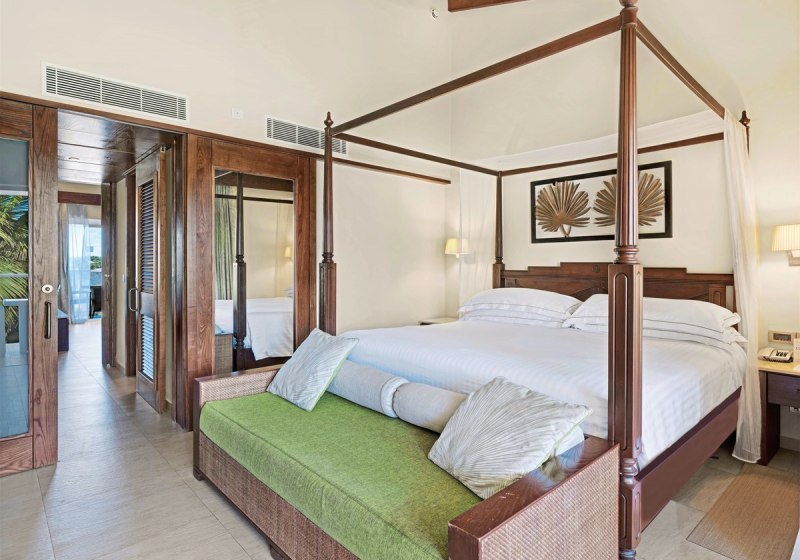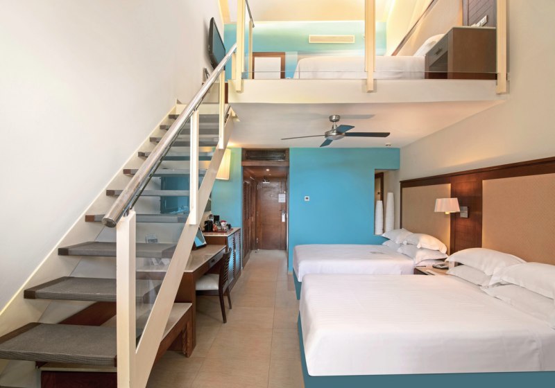 Zur Ausstattung zählen Klimaanlage und Deckenventilator, Safe, Flachbildfernseher, Telefon sowie Wi‑Fi (teils gegen Gebühr). Das Bad bietet Regenschauerdusche, Föhn, Bademantel und Slipper. Eine Kaffeemaschine, Bügeleisen mit Brett und Minibar (kategorieabhängig) ergänzen den Komfort; Familienzimmer erhalten zusätzlich Mikrowelle und Verbindungstür. Größen: ca. 37 m² (Superior) und ca. 97 m² (Family Junior Suite). Highlight: Geräumige Familien-Junior-Suiten mit Verbindungstür und Mikrowelle.