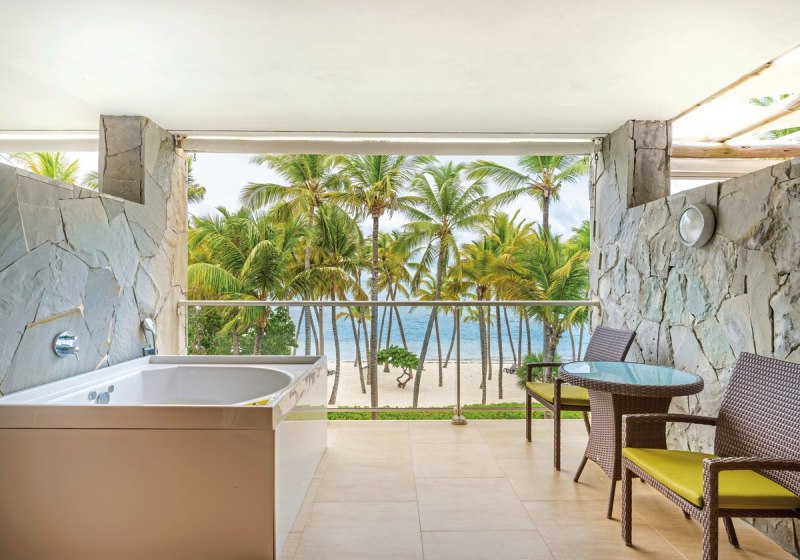 Ihr schlaft in Zimmern mit Kingsize- oder Doppelbetten, teils ergänzt um Sofabetten. Balkon oder Terrasse öffnen den Blick – je nach Kategorie Richtung Garten, Golfplatz, seitlichem Meer oder Meer. Einige Wohneinheiten verfügen über Whirlpool beziehungsweise Hydromassagewanne im Außenbereich, was den Rückzug angenehm akzentuiert.