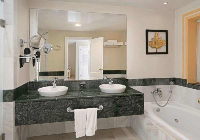 Das Bad kombiniert Dusche und Massagebadewanne; Bademantel, Hausschuhe und Föhn liegen bereit. Klimaanlage und Deckenventilator sorgen für das richtige Klima, ein Kissenmenü ergänzt den Komfort. Die Minibar ist mit Wasser, Softdrinks und Bier bestückt. Highlight: Juniorsuiten mit Massagebadewanne und Kissenmenü für spürbaren Komfort.