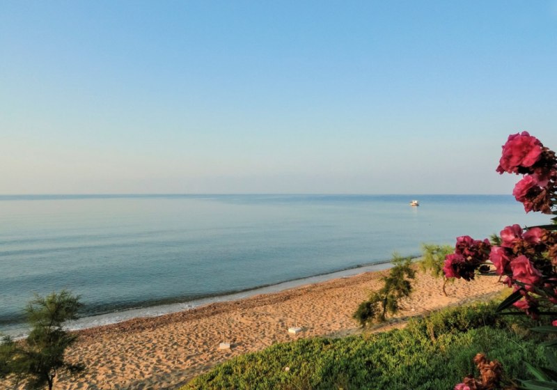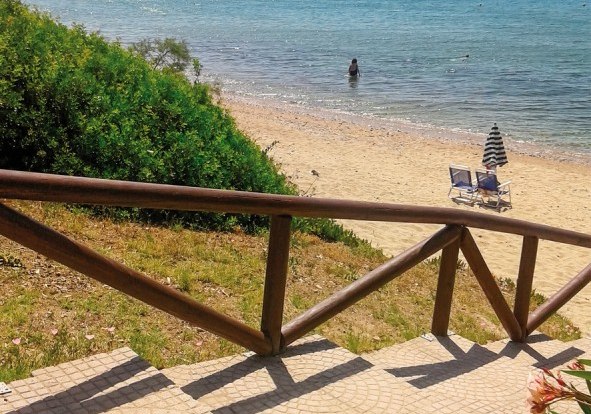 Ihr wohnt ländlich am Ortsrand, rund 800 Meter vom Ortszentrum entfernt. Der öffentliche Sand-/Kieselstrand liegt etwa 40 Meter gegenüber und ist lediglich durch eine Straße von der Anlage getrennt. So kombiniert Ihr ruhige Wohnlage mit direktem Strandbezug, während Ihr Erledigungen und abendliche Bummel im Zentrum in fußläufiger Distanz einplant.