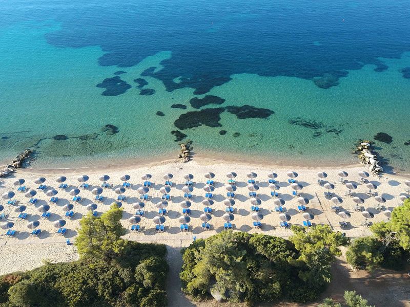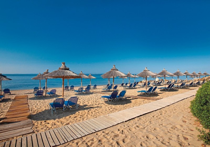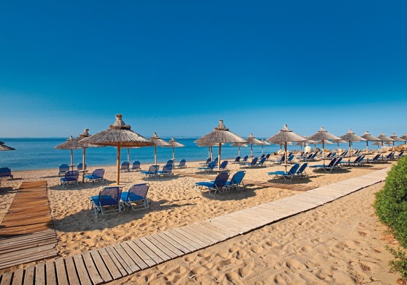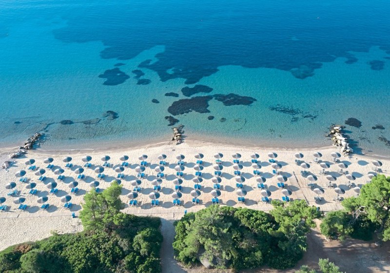Am Ortsrand von Metamorfosis gelegen, kombiniert das Blue Dolphin Hotel kurze Wege zum Meer mit Abstand zum Zentrum. Der Strand liegt etwa 100 Meter entfernt und erstreckt sich als rund 500 Meter langer Sand-Kies-Abschnitt – ideal für ausgedehnte Spaziergänge entlang der Küstenlinie. Bis ins Zentrum von Metamorfosis sind es etwa 1,5 Kilometer, sodass Ihr Restaurants, Shops und den Ortsspaziergang bequem einplant, ohne auf die ruhigere Randlage im Resort zu verzichten. Sonnenschirme stehen am Strand bereit, die Strandbar versorgt Euch ohne große Wege, und zurück in der Anlage wartet die Poolzone mit Liegen und Sonnenterrassen. Die Lage auf Sithonia schafft einen klassischen Ausgangspunkt für Strandausflüge in den Ferien und leichte Aktivitäten, während Ihr den Tag entspannt zwischen Meer, Gartenwegen und den öffentlichen Bereichen des Hauses strukturiert. Highlight: Strand und Ortsrand verbinden kurze Wege mit angenehmer Ruhe.