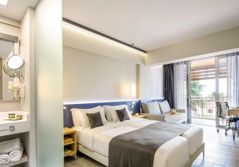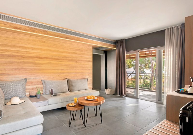 Die Zimmerausstattung ist auf Klarheit und Nutzen ausgerichtet: individuell regulierbare Klimaanlage, Balkon oder Terrasse, WLAN, Safe, TV und Minibar/Minikühlschrank bilden die Basis. Badezimmer sind je nach Kategorie mit Dusche oder Badewanne ausgestattet und bieten Föhn, Bademantel, Hausschuhe und Vergrößerungsspiegel. Familienzimmer stehen bereit, ebenso Optionen mit Meerblick. Highlight: Individuell regelbare Klimaanlage und Außenbereich steigern den Tageskomfort.