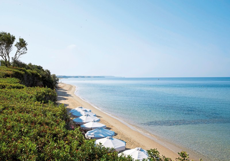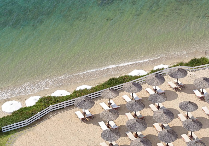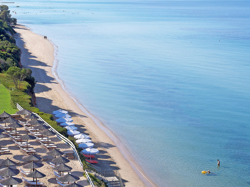 Ihr wohnt direkt am flach abfallenden Sand‑/Kiesstrand, was kurze Wege ins Wasser und entspannte Strandtage ermöglicht. Nach Nea Moudania sind es etwa vier Kilometer, ideal für einen Ausflug in die Hafenatmosphäre und kleine Einkäufe. Sonnenliegen und Schirme stehen am Strand bereit, dazu eine Strandbar für kurze Pausen zwischen Meer und Liege. Die Lage verbindet Ruhe am Wasser mit erreichbarer Ortschaft in kurzer Distanz, ohne Verkehrshürden zwischen Resort und Strand. So bleibt Euer Fokus auf Meer, Spaziergängen entlang der Uferlinie und unkomplizierter Erholung.