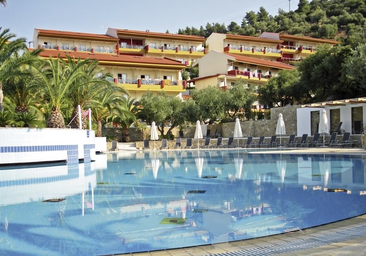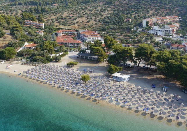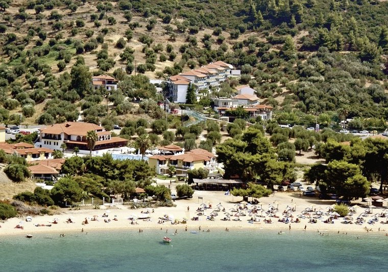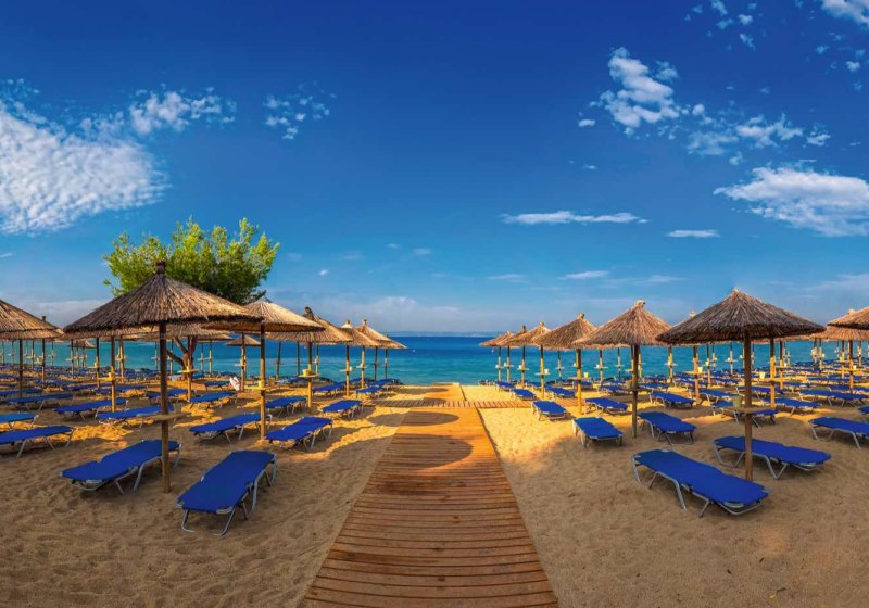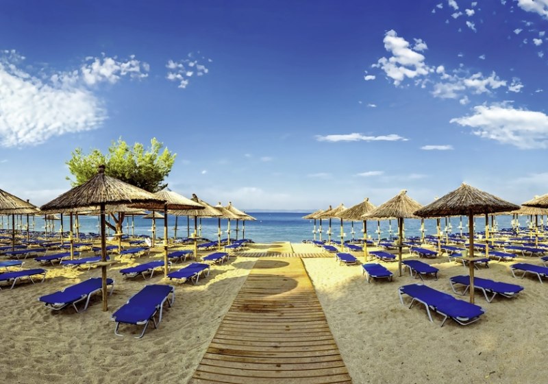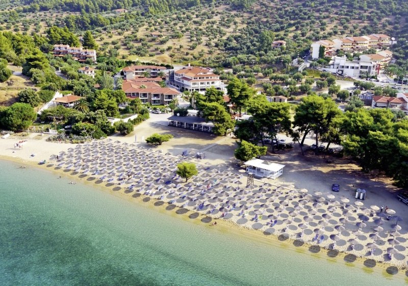 Ihr logiert in Griechenland nahe Neos Marmaras, leicht erhöht oberhalb der Straße und mit Blick auf die Bucht. Der Weg zum Sand-Kiesstrand ist kurz: Etwa 150 Meter über eine Fußgängerbrücke, die den Übergang bequem und sicher macht. Der Strand trägt die Blaue Flagge, was für geprüfte Wasserqualität und gepflegte Verhältnisse steht. Eine Linienbushaltestelle befindet sich direkt am Hotel, wodurch Ausflüge ohne eigenes Auto unkompliziert gelingen. Neos Marmaras liegt etwa sechs Kilometer entfernt – nah genug für Abstecher, weit genug für ruhige Tage am Wasser. Vor Ort erwartet Euch zudem eine Strandbar, Liegestühle und Sonnenschirme ergänzen die Badeinfrastruktur sinnvoll. So entsteht eine Lage, die beides verbindet: eine entspannte Basis am Meer und eine praxistaugliche Anbindung für Eure Touren. Highlight: Direkte Busanbindung und fußläufiger Strand mit Blauer Flagge – alltagstauglich geplant.