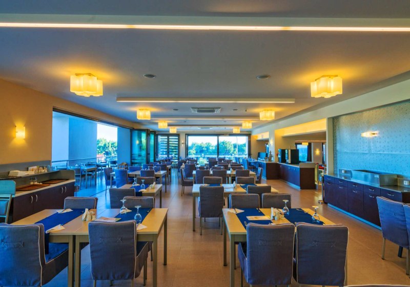 Im Hauptrestaurant erwartet Euch Buffetküche mit der Freiheit, Euren Teller nach eigener Vorliebe zu gestalten. Live-Kochen setzt frische Akzente, vegetarische Optionen sind eingeplant. Ergänzend greift Ihr tagsüber zu Snacks, alkoholfreien und alkoholischen Getränken. Wer nah am Wasser isst, steuert die Taverne am Strand an – unkompliziert, mit kurzen Wegen zwischen Bad und Tisch. Highlight: Buffet mit Live-Kochen bietet flexible Auswahl ohne Wartezeiten.