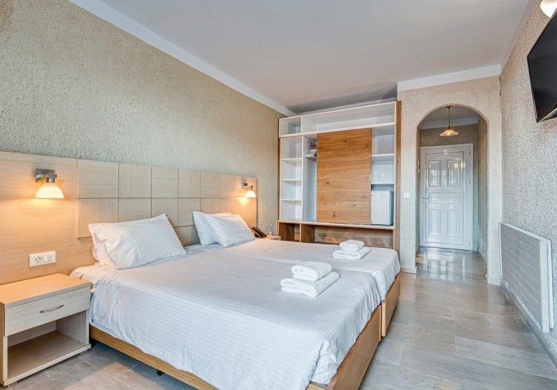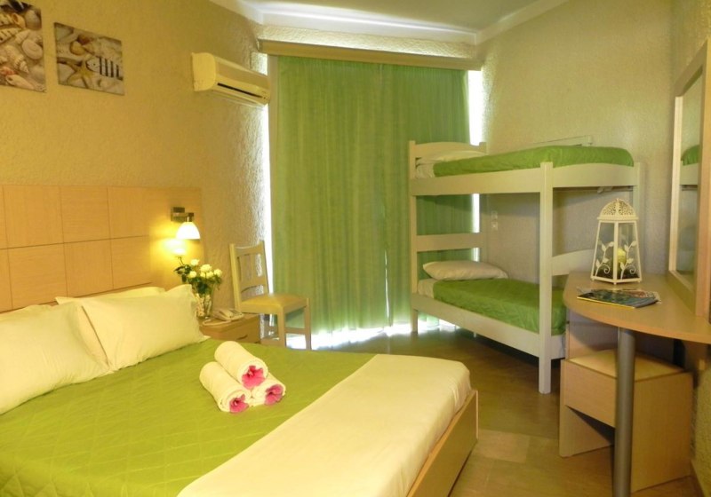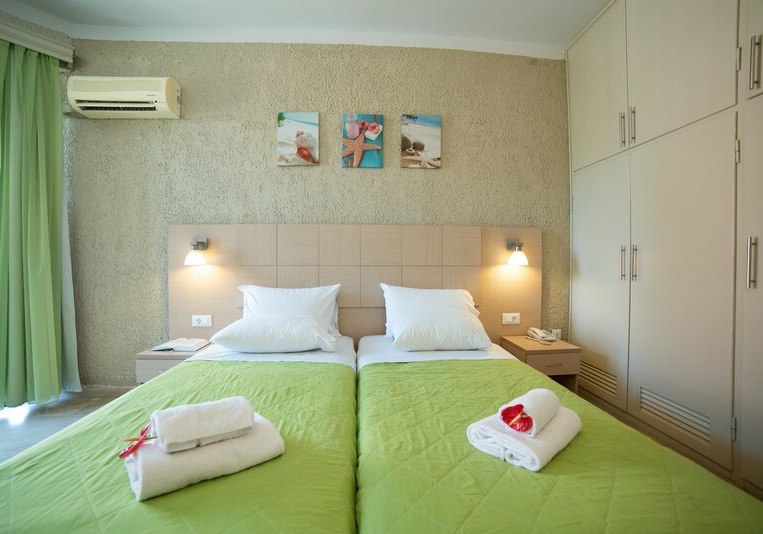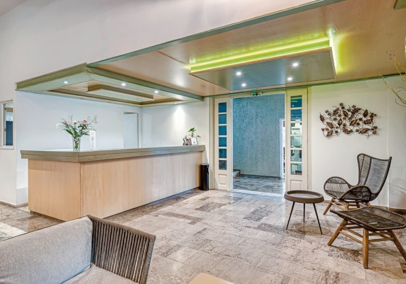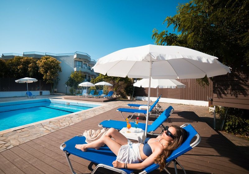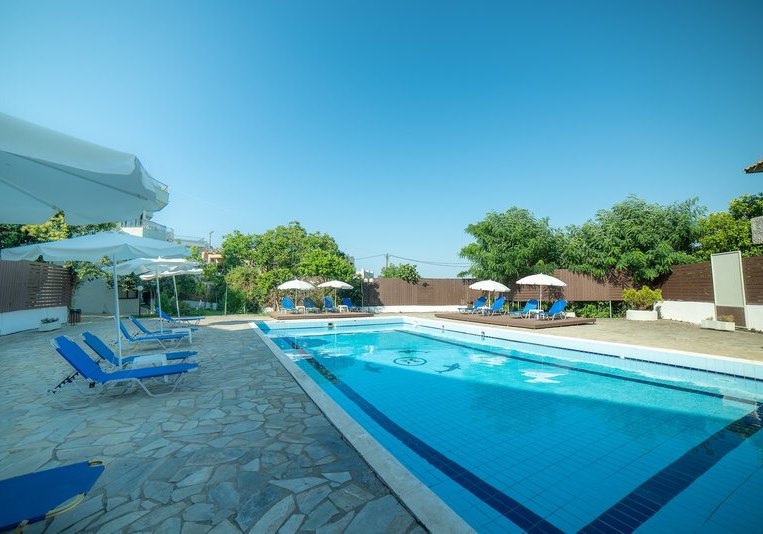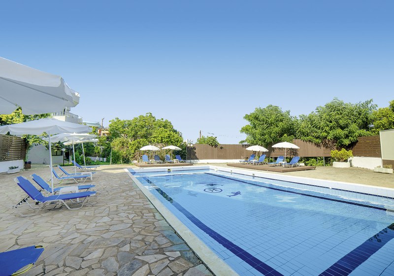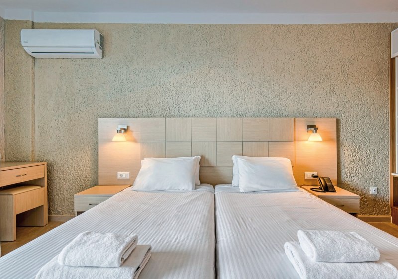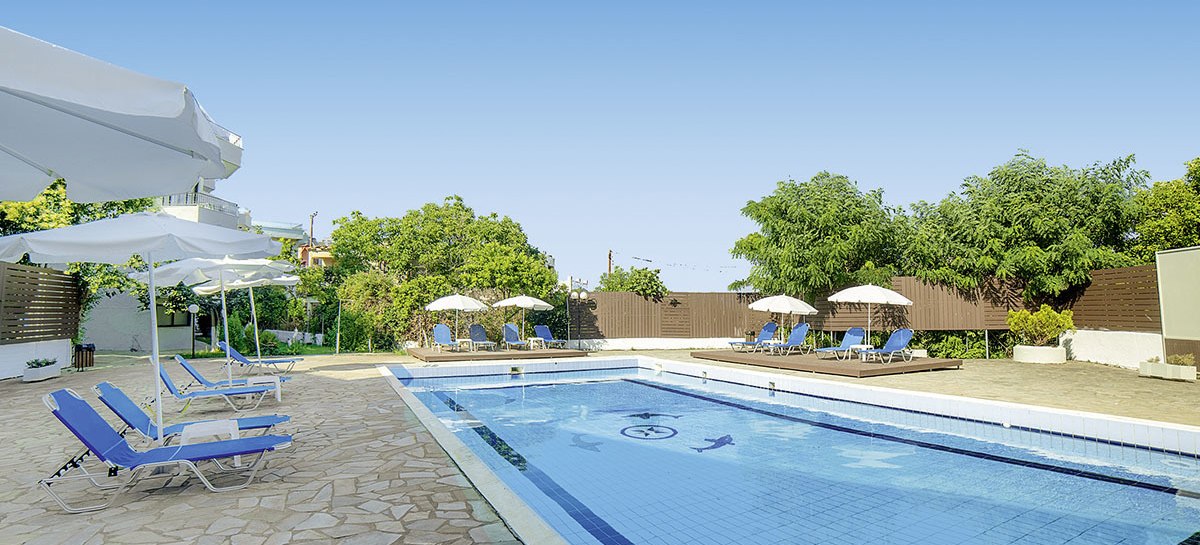 Im Alkionis wohnt Ihr in einem überschaubaren Haus mit 62 Zimmern, verteilt auf zwei Gebäude. Das Ambiente wirkt angenehm unkompliziert: freundlicher Empfang an der 24-Stunden-Rezeption, klare Wege, kompakte Außenbereiche mit Süßwasserpool und Sonnenterrasse. 2022 wurde teilweise renoviert – spürbar in frischen Details, ohne den Charakter zu überdecken. Familien fühlen sich dank Spielplatz und Miniclub ebenso wohl wie Paare, die eine solide Basis für entspannte Strandtage suchen.