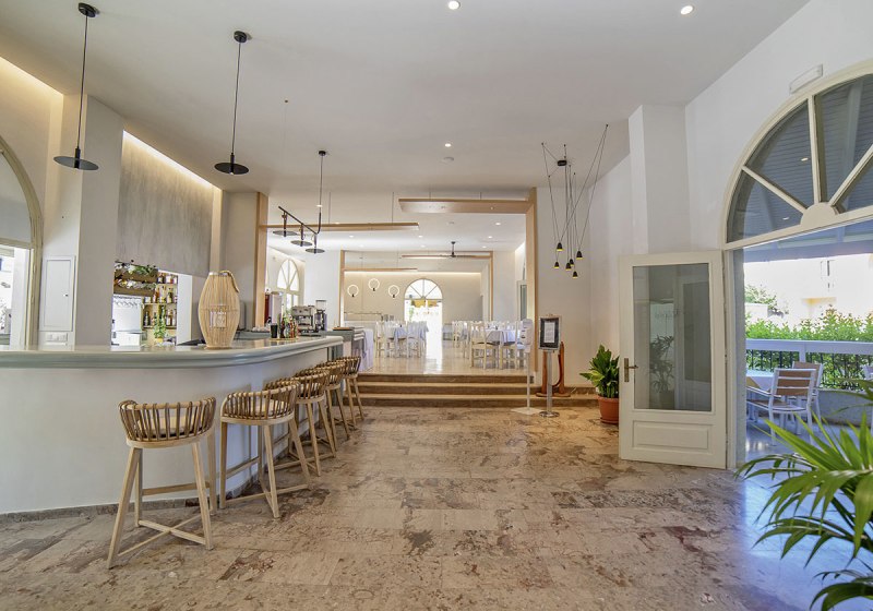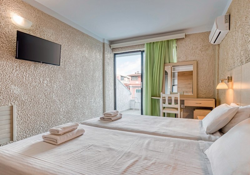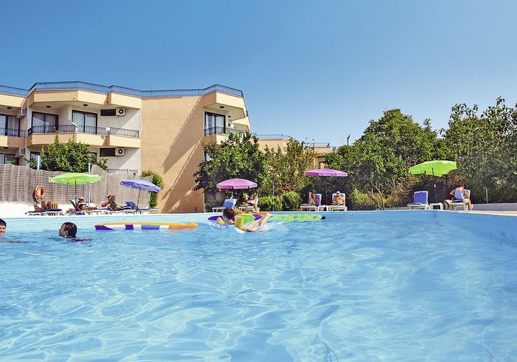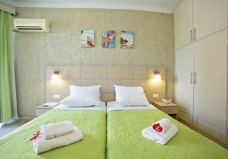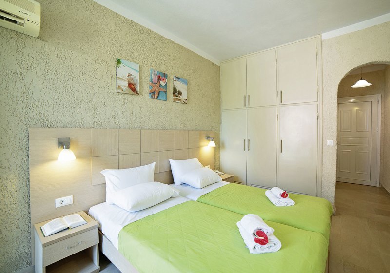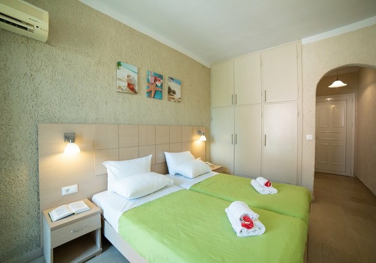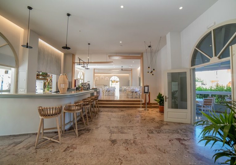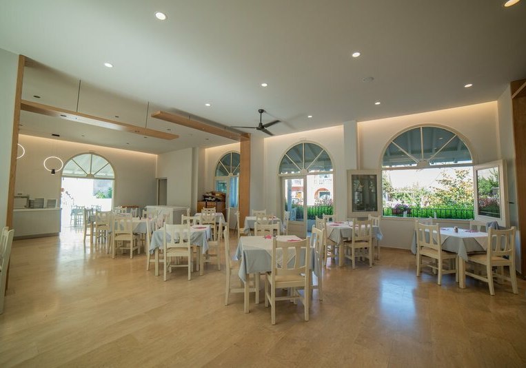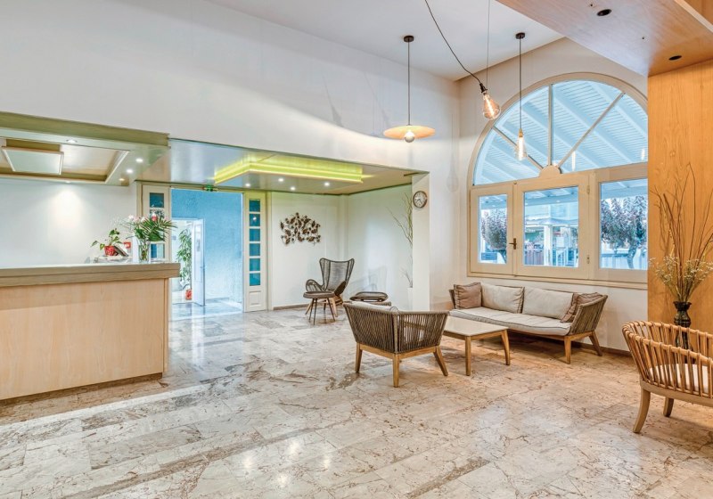 Im Alkionis wohnt Ihr in einem überschaubaren Haus mit 62 Zimmern, verteilt auf zwei Gebäude. Das Ambiente wirkt angenehm unkompliziert: freundlicher Empfang an der 24-Stunden-Rezeption, klare Wege, kompakte Außenbereiche mit Süßwasserpool und Sonnenterrasse. 2022 wurde teilweise renoviert – spürbar in frischen Details, ohne den Charakter zu überdecken. Familien fühlen sich dank Spielplatz und Miniclub ebenso wohl wie Paare, die eine solide Basis für entspannte Strandtage suchen.