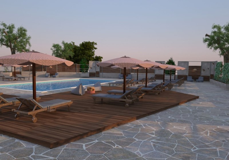 - Süßwasserpool: Liegewiese und Sonnenschirme für entspannte Poolstunden.